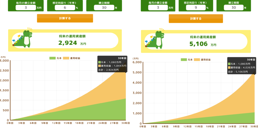 毎月3万円を30年間投資 年率6%と9%投資していた場合どうなっていたか見てみましょう。
